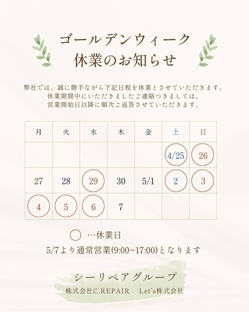 ゴールデンウィーク休業のお知らせ|シーリペアグループ